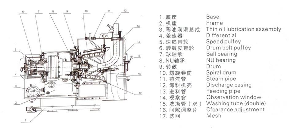 為了減少固態物的排放阻力,過濾筒有一定的傾斜角度(脫水角度)。利用傾斜角度和螺旋葉片,減少了固體排放阻力。不但極大的提高了其排放效率,而且具有耗電量低,處理量大的優點。