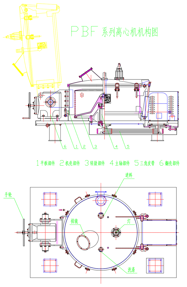 3.全翻殼設計:可對離心機外殼與轉鼓夾層空間進行徹底清洗,有效清除批次間的交叉污染。上蓋設置,進料、水洗、視鏡、防爆燈、充氮口。